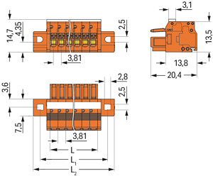 1-Leiter-Federleiste; Drücker; Push-in CAGE CLAMP®; 1,5 mm²; Rastermaß 3,81 mm; 14-polig; 100% fehlsteckgeschützt; Befestigungflansch; 1,50 mm²; orange