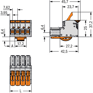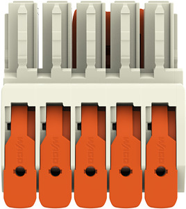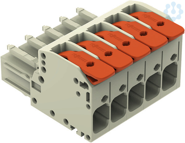 1-Leiter-Federleiste; Hebel; Push-in CAGE CLAMP®; 10 mm²; Rastermaß 7,62 mm; 5-polig; 100% fehlsteckgeschützt; mittige Verriegelungsklinke; 10,00 mm²; lichtgrau