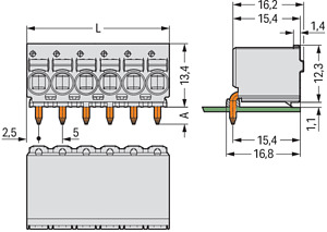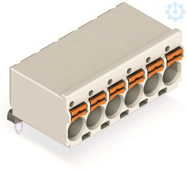 1-Leiter-THR-Federleiste, abgewinkelt; Drücker; Push-in CAGE CLAMP®; 2,5 mm²; Rastermaß 5 mm; 4-polig; Lötstift Ø 1,4 mm; 2,50 mm²; lichtgrau