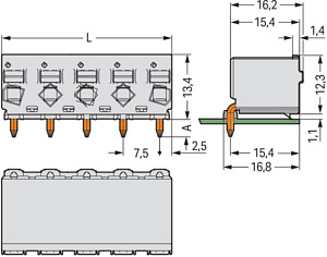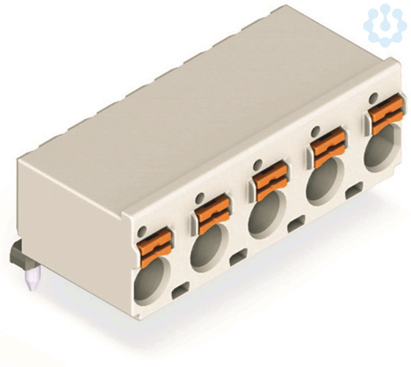 1-Leiter-THR-Federleiste, abgewinkelt; Drücker; Push-in CAGE CLAMP®; 2,5 mm²; Rastermaß 7,5 mm; 4-polig; Lötstift Ø 1,4 mm; 2,50 mm²; lichtgrau