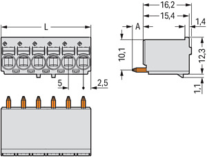 1-Leiter-THT-Federleiste, gerade; Drücker; Push-in CAGE CLAMP®; 2,5 mm²; Rastermaß 5 mm; 5-polig; Lötstift Ø 1,4 mm; direkt bedruckt; 2,50 mm²; lichtgrau