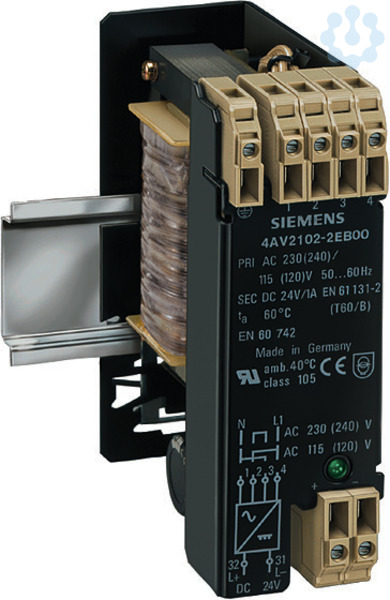 STROMVERSORGUNG, PHASEN:1, PN(KW):0,024, UPRI(V):230-115, USEC(V DC):24, ISEC(A DC):1/1,2 (60/40 CEL), F(HZ):50...60, SCHALTGR./SCHIRMW.:II0 /0, SCHUTZKL.:I, TA/ISOKL:60 /B, W(%):5, IP00, ANSCHLUSS:SCHRAUB-/FLACHSTECK- ANSCHLUSS, MONTAGE:HUTSCHIENE, EN 61558-2-6, EN61131-2 >SICHERHEITSTRANSFORMATOR< Die Stromversorgungen 4AV liefern eine ungeregelte Gleichspannung von 24 V DC auf Basis von Einphasen- bzw. Dreiphasen-Sicherheitstransformatoren mit nachgeschalteten Gleichrichtern und Kondensatorsiebung nach EN61131-2.