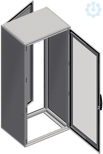 Spacial SF-E geeignetes Gehäuse mit 2 glatten Türen für Vorder- und Rückseite. Elektronische Anwendung. Bodenstehende Montage. Ohne Befestigungsplatte. 4-Punkt-Verschlusssystem mit Griff und 5 mm Doppelstabschlosseinsatz. Verzinktes Stahlblech für Rahmen und Ständer. Schutzart IP 55, IK08 bei transparenter Tür, IK10 bei glatter Tür, Grau RAL 7035.
