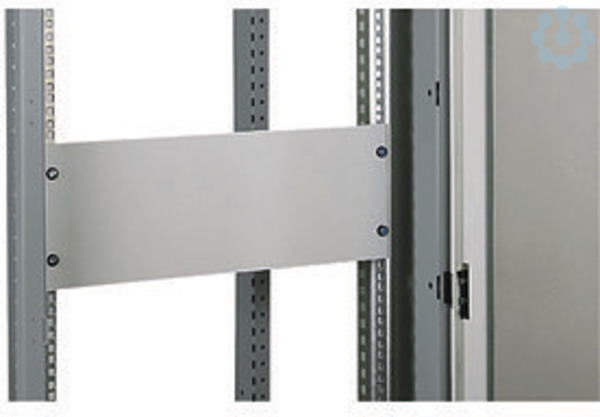 An den 19-Zoll-Schienen befestigte Frontplatte für die Kabelführung. Stahl-Frontplatte, RAL7035, lichtgrau. 1HE hohe Platte. Produktfamilie Actassi.
