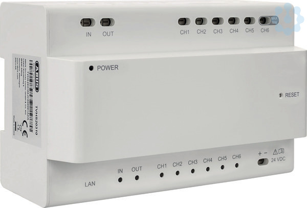 Der 2-Draht-Verteiler (Distributor, Konverter Unit) stellt die Kommunikation zwischen 2-Draht-Videomodul TVHS20010 und 2-Draht Touch Monitor (Innenstation) TVHS20210 her. Der Verteiler ist eine notwendige Komponente zur Installation der ModuVis Türsprechanlage mit 2-Draht-Technik.
