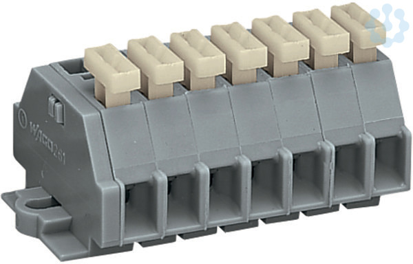 2-Leiter-Klemmenleiste; einseitig mit Drückern; mit Befestigungsflanschen; 7-polig; für Schraub- u.ä. Befestigungsarten; Befestigungsloch Ø 3,2 mm; 2,5 mm²; CAGE CLAMP®; 2,50 mm²; grau