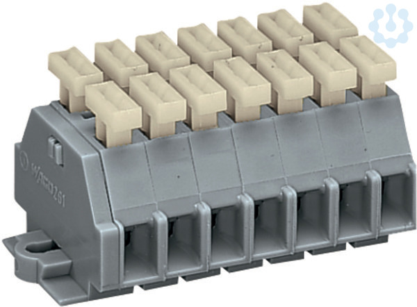2-Leiter-Klemmenleiste; beidseitig mit Drückern; mit Befestigungsflanschen; 7-polig; für Schraub- u.ä. Befestigungsarten; Befestigungsloch Ø 3,2 mm; 2,5 mm²; CAGE CLAMP®; 2,50 mm²; grau