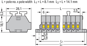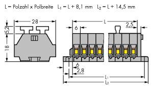 2-Leiter-Klemmenleiste; beidseitig mit Drückern; mit Befestigungsflanschen; 9-polig; für Schraub- u.ä. Befestigungsarten; Befestigungsloch Ø 3,2 mm; 2,5 mm²; CAGE CLAMP®; 2,50 mm²; grau