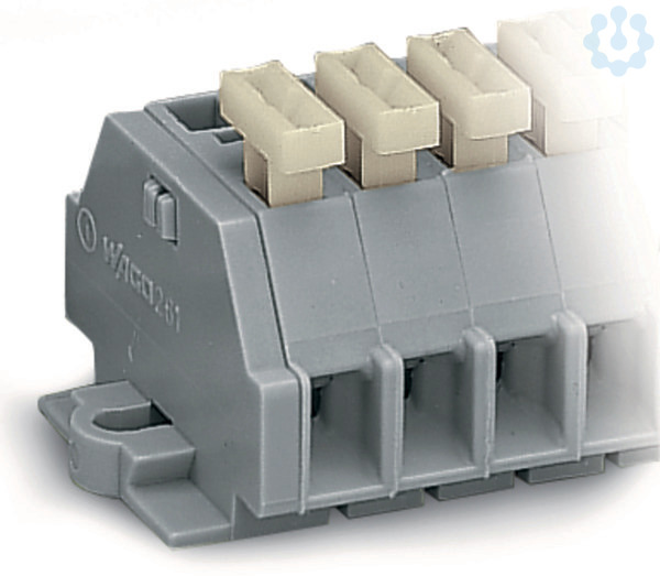 2-Leiter-Klemmenleiste; einseitig mit Drückern; mit Rastfüßen; 6-polig; für Blechdicke 0,6 - 1,2 mm; Befestigungsloch Ø 3,5 mm; 2,5 mm²; CAGE CLAMP®; 2,50 mm²; grau