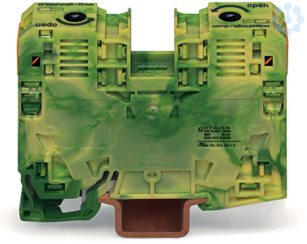 2-Leiter-Schutzleiterklemme; 35 mm²; für Anwendungen Ex e II geeignet; seitliche Beschriftungsaufnahmen; nur auf Tragschiene 35 x 15; POWER CAGE CLAMP; 35,00 mm²; grün-gelb