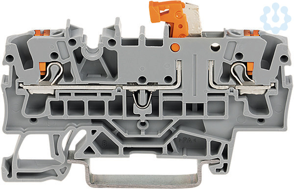 2-Leiter-Trenn- und Messklemme; mit Drücker; mit Prüfmöglichkeit; Trennmesserhalter orange; für Tragschiene 35 x 15 und 35 x 7,5; 2,5 mm²; Push-in CAGE CLAMP®; 2,50 mm²; grau