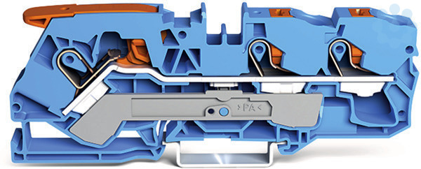 3-Leiter-Durchgangsklemme; mit Hebel und Drücker; 10 mm²; mit Prüföffnung; für Anwendungen Ex i geeignet; seitliche und mittige Beschriftung; für Tragschiene 35 x 15 und 35 x 7,5; Push-in CAGE CLAMP®; 10,00 mm²; blau