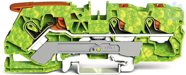3-Leiter-Schutzleiterklemme; mit Hebel und Drücker; 10 mm²; mit Prüföffnung; seitliche und mittige Beschriftung; für Tragschiene 35 x 15 und 35 x 7,5; Push-in CAGE CLAMP®; 10,00 mm²; grün-gelb