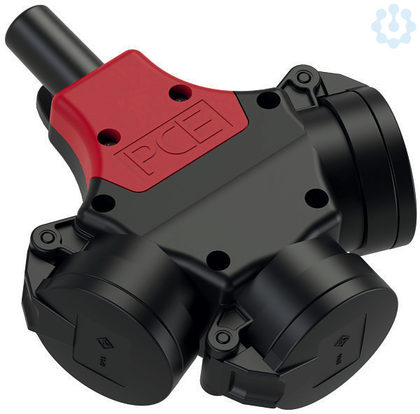 3-Wege Schutzkontaktkupplung Gummi mit Klappdeckel; 16A 2p+E 250V IP44 (nach österr./deutsch. System); Einsatz: Polyamid; innenliegende Zugentlastung; 3-polige Anschlussklemme; für erschwerte Bedingungen; Schutzart: IP44