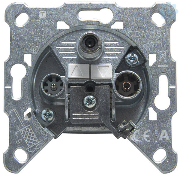 GDM 19 - 3-Loch Multimedia-Durchgangs-Dose3-Wege-Multimediadosen dienen zum Anschluss von TV-Gerät, FM-Radio sowie Datenmodem an moderne BK-Kabelfernsehnetze mit Internetzugang. Die neu entwickelte TRIAX Dosen-Plattform lässt Sie heute Zeit und morgen Geld sparen - die Dosen sind komfortabel zu installieren und sowohl für die aktuellen als auch für erweiterte Anforderungen in der Zukunft bestens gerüstet.Merkmale: Frequenzbereich von 5-1200-1800 MHz für alle Stufen einer zukünftigen DOCSIS-3.1-Migration, kompatibel mit dem gegenwärtigen Betriebsmodus, exzellente Signal-Übertragungseigenschaften, erhöhte Schirmung Klasse A+ 10dB, schnelle und zuverlässige Montage (Steck-Klemme-Technik), geprüft und gelistet z. B. von Vodafone Kabel Deutschland