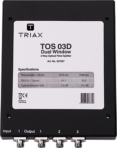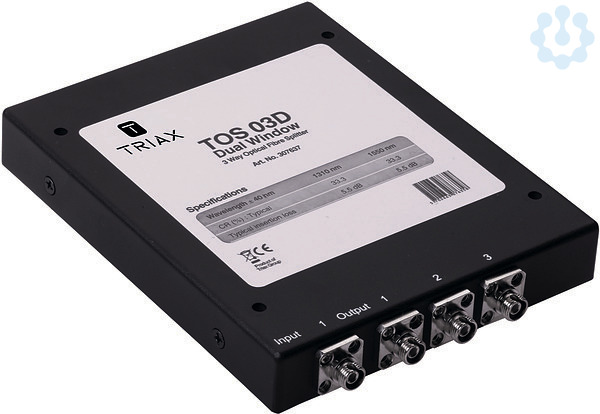 TOS 03D, optischer Verteiler 3-fach mit Kabel. Für Singlemode-Systeme. Hervorragende mechanische Stabilität. Geringe Eingangsdämpfung. Vorkonfektioniert mit 1 m langem Pigtail und FC/PC-Steckern. Wellenlänge 1310 oder 1550 nm.