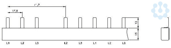 3-polige Eurovario-Phasenschiene, grau Querschnitt: 10mm² Modulbreite: 17,8mm Schrittabstand: 53,4mm Fahnenanzahl: 11 Eindringtiefe: 12mm Phasenfolge: L1,L2,L3,H2,L1,L2,L3,L1,L2,L3,... Länge: 212mm Stegbreite: 4mm Bauform: E Fabrikatszuordnung: Standard, ABL, Doepke, F&G, Mersen, GE/AEG, Hager, Legrand, Merlin Gerin, Moeller, OEZ, Schneider, Schrack, Siemens, Woehner, Eaton, Noark, Rockwell Anwendung: FI - LS