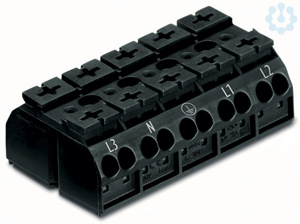 4-Leiter-Geräteanschlussklemme; mit PE-Kontakt; L3-N-PE-L1-L2; 5-polig; für Schraube und Mutter M3; 4 mm²; 4,00 mm²; schwarz