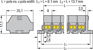 4-Leiter-Klemmenleiste; ohne Drücker; mit Befestigungsflanschen; 9-polig; für Schraub- u.ä. Befestigungsarten; Befestigungsloch Ø 3,2 mm; 1,5 mm²; CAGE CLAMP®; 1,50 mm²; grau