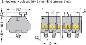 4-Leiter-Klemmenleiste einseitig mi t Betätigungsdrückern mit Rastfüsse