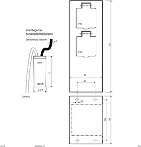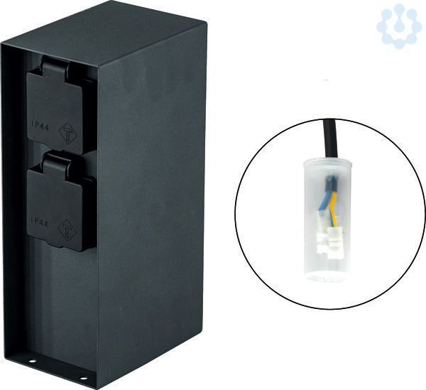 Der 4-fach Energieverteiler ist aus Edelstahl gefertigt und pulverbeschichtet. Auf beiden Seiten des Verteilers befinden sich je zwei Schutzkontaktsteckdosen. Die Befestigung erfolgt mittels vier Schrauben auf befestigtem Untergrund. Über die große Öffnung auf der Unterseite kann problemlos das Zuleitungskabel eingeführt werden.