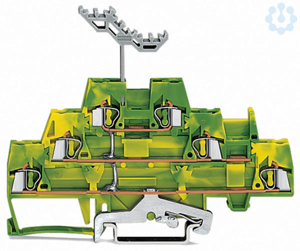 Dreistockklemme; 6-Leiter-Schutzleiterklemme; 2,5 mm²; mit Beschriftungsträger; intern gebrückt; für Tragschiene 35 x 15 und 35 x 7,5; CAGE CLAMP®; 2,50 mm²; grün-gelb
