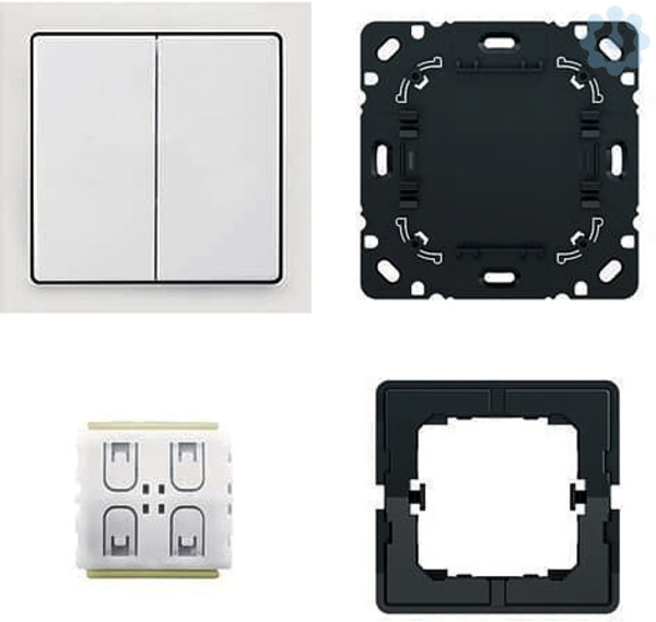 Bestehend aus BLE-Smart-Switch-Einsatz 6716 UBT, 2fach-Wippe 6736 FoH-8xx für Smart-Switches, Abdeckrahmen 1fach future® linear, Befestigungsplatte und Zwischenring.