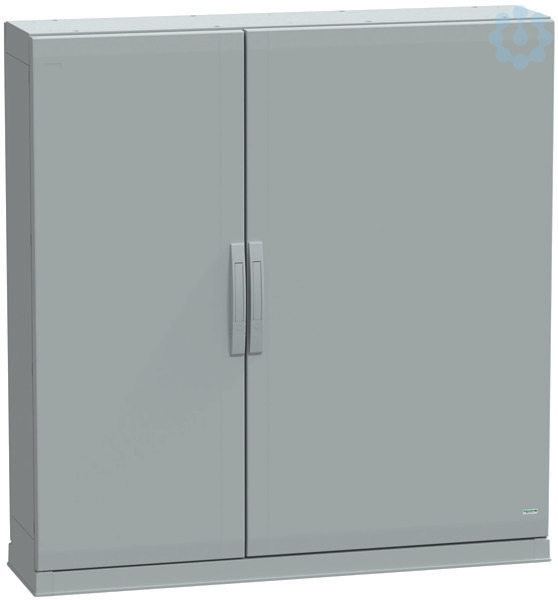 Polyestergehäuse mit offenem Boden. Dach geschlossen. zwei demontierbare Seitenwände. Verriegelungssystem mit Griff und 5mm-Doppelbarteinsatz. Türöffnung 120°. Sockelrahmen am Boden des Gehäuses. Abmessung (HxBxT) 1000x1000x320 mm. IK Schutzart (Stoßfestigkeit) IK10 bei Volltüren. IP-Schutzart (Berührungsschutz, Staub, Wasser) IP54 gemäß IEC 60529. Komplett isolieren für Baugruppen der Klasse II gemäß IEC 64139-1.