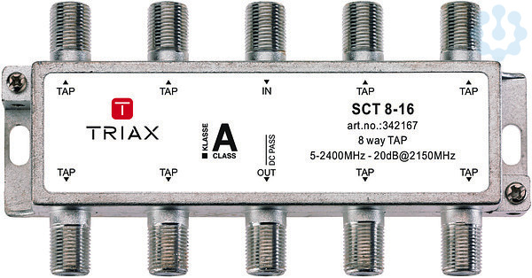 8-fach-Abzweiger, ideal für den Einsatz in SAT-ZF- und DVB-T Verteilanlagen, Frequenzbereich 5 - 2400 MHz, DC-Durchlass von allen Ausgängen, entkoppelt über Dioden zum Eingang, A-Klasse Schirmung gegen Einstrahlungen wie LTE Telefonie, hochwertiges Zink-Druckgussgehäuse, zinnbeschichtet mit verlöteter Grundplatte, Klemmen für Potentialausgleich
