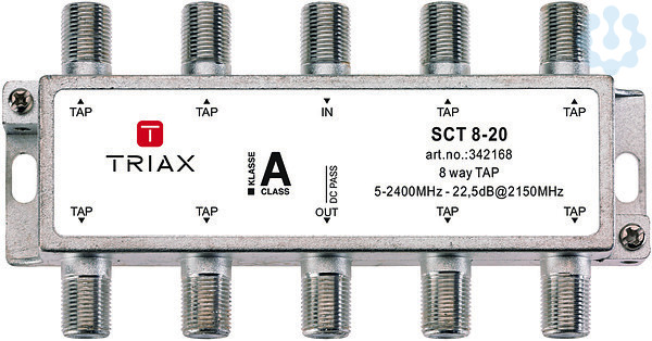8-fach-Abzweiger, ideal für den Einsatz in SAT-ZF- und DVB-T Verteilanlagen, Frequenzbereich 5 - 2400 MHz, DC-Durchlass von allen Ausgängen, entkoppelt über Dioden zum Eingang, A-Klasse Schirmung gegen Einstrahlungen wie LTE Telefonie, hochwertiges Zink-Druckgussgehäuse, zinnbeschichtet mit verlöteter Grundplatte, Klemmen für Potentialausgleich
