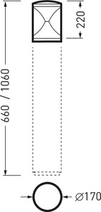 Poller-Kopfeinheit mit doppelkegelförmigem, opalen PMMA-Reflektor. In Kombination mit separat zu bestellenden Standrohren in verschiedenen Ausführungen und Höhen zu verwenden. Zur Orientierungsbeleuchtung im Außenbereich. 2 LED Module mit jeweils 4 LED in einem Linsensystem integriert, direkt strahlend. Mit rotationssymmetrisch breit strahlender Lichtstärkeverteilung. Zur flexiblen Anpassung an kundenspezifische Beleuchtungsaufgaben stehen weitere Abstrahlcharakteristiken zur Verfügung. Bemessungslichtstrom 950 lm, Bemessungsleistung 10,00 W, Leuchten-Lichtausbeute 95 lm/W. Lichtfarbe warmweiß, ähnlichste Farbtemperatur (CCT) 3000 K, allgemeiner Farbwiedergabeindex (CRI) Ra > 70. Farborttoleranz (initial MacAdam) ≤ 5 SDCM, Mittlere Bemessungslebensdauer L80(tq 25 °C) = 80.000 h. Standrohr aus Aluminium-Strangpressprofil. Farbe anthrazit, ähnlich DB703 mit Metalleffekt, hochwetterfest, pulverbeschichtet. (DB 703). Seewetter geeignete Beschichtung auf Anfrage. Leuchtendurchmesser 172 mm, Leuchtenhöhe 220 mm. Gewicht: 3,5 kg. Abschlusszylinder aus hochschlagzähem PMMA, klar. Schutzklasse (EN 61140): II, Schutzart (DIN EN 60529): IP65, Stoßfestigkeitsgrad nach IEC 62262: IK04. Mit elektronischem Vorschaltgerät, digital dimmbar (DALI). Betriebsgerät gemäß DALI-2-Standard (EN 62386). Das Produkt erfüllt die grundlegenden Anforderungen der anwendbaren EU-Richtlinien und des Produktsicherheitsgesetzes und trägt die CE-Kennzeichnung.