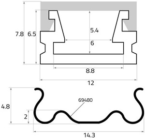 Sehr flaches Aluprofil ohne Aluminium Sichtkante Innenmaß geeignet für Strips bis 6 mm Breite für die Innenanwendung Material: Aluminium eloxiert LxBxH in mm: 2.000 x 12 x 7,8 Lieferhinweis: Lieferung ohne Zubehör - bitte separat bestellen