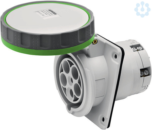 Anbausteckdose fuer industrielle Anwendungen gemaess IEC 60 309 (EN 60 309) Neigung 10° vernickelte Kontakte, Metallteile aus Edelstahl, Kunststoffteile halogenfrei gemaess EN 50 267-2-2, Anschlusstechnik: Schraubklemme, Anschlussquerschnitt 16 - 50 mm² feindraehtig / 25 - 70 mm² ein- oder mehrdraehtig, Temperaturbereich -25 - +40 °C, UV Bestaendig, Stossfestigkeit IK09