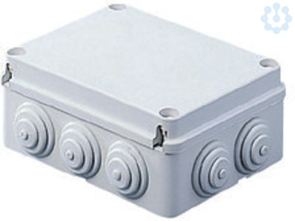Abzweigkasten eckig, mit Kabeltuellen, geschlossenem flachem Schraubdeckel mit plombierbaren Kunststoffschrauben.