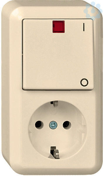 Kombination Kontroll-Ausschalter 2-polig beleuchtet und Steckdose, Farbe: perlweiß, Schalter: 10 A 250V AC, Steckdose 16 A 250V AC, Für Aufputzmontage, Schutzart IP 20, mit Grundplatte, für Montage auf brennbarem Untergrund geeignet. Steckklemmen: Klemmbereich für Kupferleiter 1,5 mm und 2,5 mm.