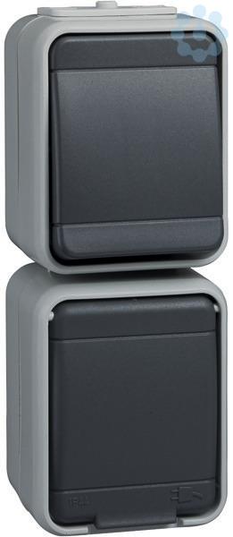 Universalschalter und Steckdose senkrecht. Farbe: licht-/basaltgrau, Kombinationen Schalter 10 A 250V AC/ Schutzkontakt-Steckdose 16 A 250V AC, für Aufputzmontage. Schutzart IP 44, mit zwei Leitungseinführungen, Steckklemmen: Klemmbereich für Kupferleiter 1,5 mm und 2,5 mm, Verbindungsklemmen nach VDE 0620.