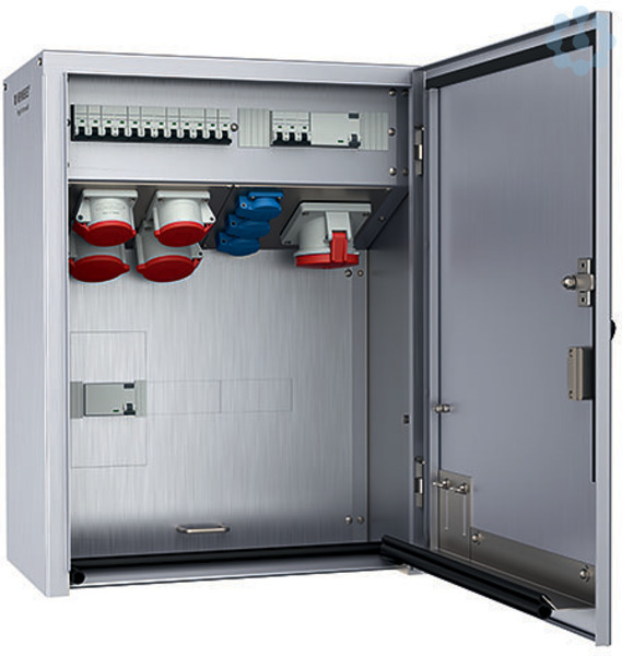 MENNEKES Aufputz-Verteiler Schutzart IP 44 Gehaeuse: 1 Edelstahlgehaeuse, 1.4301 geschliffen, K240 700x530x350 mm (HxBxT) Bestueckung/Absicherung: Pos.01 1 CEE-Steckdose 63A 5p 400V Pos.02 2 CEE-Steckdosen 32A 5p 400V 2 LS-Schalter 32A 3p C Pos.03 2 CEE-Steckdosen 16A 5p 400V 2 LS-Schalter 16A 3p C Pos.04 3 SCHUKO-Steckdosen 16A 2p+E 230V 3 LS-Schalter 16A 1p B Pos.01,04 1 LS-Schalter 63A 3p C (Vorsicherung FI) 1 FI-Schutzschalter 63A 4p IFN=0,03A Pos.02-03 1 LS-Schalter 63A 3p C (Vorsicherung FI) 1 FI-Schutzschalter 63A 4p IFN=0,03A Leitungseinfuehrung/Anschlussmoeglichkeit: 2 x Leitungseinfuehrungstuelle unten,geeignet fuer Leitungsdurchmesser von 13-43mm 2 x Messing - Verschlussschrauben M16 unten 1 x Messing - Verschlussschraube M20 unten Klemme fuer 2 Leitungen bis 5 x 50 mm² Fronttuer mit Schwenkhebelgriff und Profilhalbzylinder Bei gesteckten Steckern abschliessbar Gesamtgewicht: ca. 50KG Der Schutzgrad IP 44 wird nur bei einer optimal auf den Kabeldurchmesser eingestellten Kabelrampe erreicht !