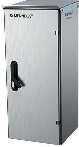 MENNEKES Aufputz-Verteiler als Not-Strom-Einspeisung anschlussfertig verdrahtet Schutzart IP 44 Gehaeuse: 1 Edelstahlgehaeuse, 1.4301 geschliffen, K240 700x300x310 mm (HxBxT) Bestueckung/Anschlussmoeglichkeit: 1 x CEE Anbaugeraetestecker 125A 5p 6h 400V (1983) 1 Klemmenleiste 5 x 50mm² Leitungseinfuehrung: 2 x Leitungseinfuehrungstuelle unten,geeignet fuer Leitungsdurchmesser von 13-49mm 1 x Messing - Verschlussschraube M20 unten Fronttuer mit Schwenkhebelgriff und Profilhalbzylinder bei gesteckter Kupplung verschliessbar; 1 Erdungsschraube M6 innen 1 Set Wandbef.laschen (90432000) Gesamtgewicht: ca. 30 KG