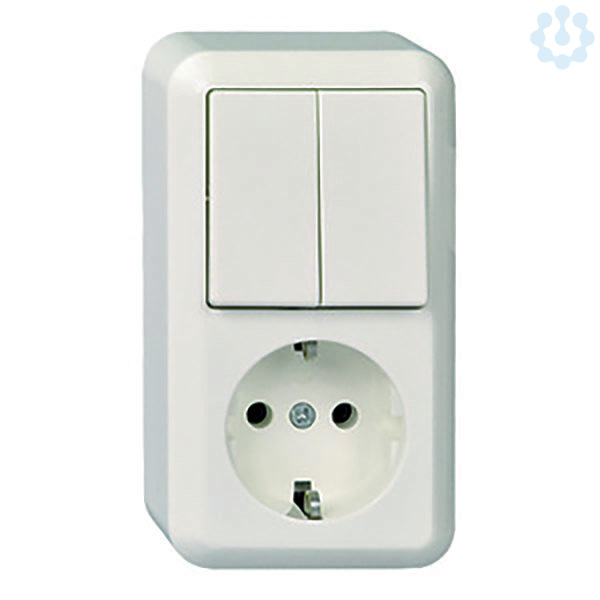Kombination Serienschalter und Steckdose, Farbe: reinweiß, Schalter: 10 A 250V AC, Steckdose 16 A 250V AC, Für Aufputzmontage, Schutzart IP 20, mit Grundplatte, für Montage auf brennbarem Untergrund geeignet. Schraubklemmen: Klemmbereich für Kupferleiter 1,5 mm und 2,5 mm , für den sicheren Anschluss von Aluminiumleitern 2,5 mm ohne Vorbehandlung.