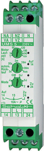 AUF/ZU-Steuerung mit Nebenstelleneingängen für Gruppen- und Zentralsteuerung. Diese Motor-Rechts-/Linkslauf-Steuerung wird u. a. für Rollläden, Jalousien, Tor-antriebe eingesetzt und ist mit handelsüblichen mechanisch unverriegelten Tastern ansteuerbar. Durch die vorrangigen Nebenstelleneingänge ist es möglich, mehrere UMS 5 zu Gruppen- und Zentralsteuerungen zusammenzufassen. Die Motorlaufzeit kann zeitlich begrenzt werden (3-240 s) um z.B. bei mechanischer Blockade den Motor nicht zu überlasten. Eine komfortable, automatische und einstellbare Schließfunktion verhindert u.a. ein unbeabsichtigtes Offenlassen eines Dachfensters. Die wählbare Jalousiebetriebsart ermöglicht eine exakte Positionierung der Lamellen von schnelllaufenden Jalousien., Maße: 18x55mm, 230V AC - 2S pf 10A