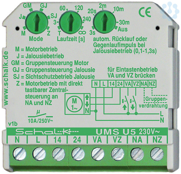 Hierbei handelt es sich um die sehr kompakte UP-Variante der bewährten und vielseitig einsetzbaren Motorsteuerung UMS 5. Durch die vorrangigen Nebenstelleneingänge ist es möglich, mehrere UMS U5 zu Gruppen- und Zentralsteuerungen zusammenzufassen. Die Motorlaufzeit kann zeitlich begrenzt werden um z.B. bei mechanischer Blockade den Motor nicht zu überlasten. Eine komfortable, automatische und einstellbare Schliessfunktion verhindert u.a. ein unbeabsichtigtes Offenlassen eines Dachfensters. Bei Jalousie-steuerung können die Lamellen exakt verstellt, oder beim Abschalten automatisch auf einen bestimmten Winkel eingestellt werden. Laufzeit 3 - 240 s, autom. Rücklaufzeit 3s - 30 min, Gegenlaufimpuls 0,1 - 1,3s, Maße: 43x43x18,5mm
