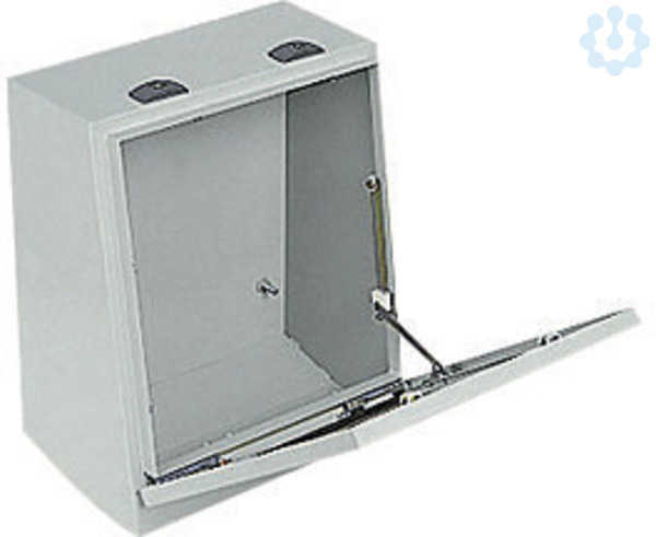 Modulare Konsole für Spacial SD Kompakt-Leitstand mit Rückwand. B 400 x T 200mm. Verschluss der Klappe über 2 Vorreiber mit 3mm Doppelbarteinsatz auf dem Gehäuse. Öffnungswinkel der Klappe 75°. Stahlblech, Epoxid-Polyester-Pulverbeschichtung. Schutzart IP55, IK10. Grau RAL 7035.