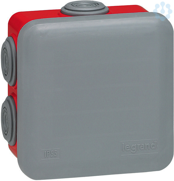 Legrand Abzweigdose Plexo. Quadratisch 80 x 80 x 45 mm (H x B x T), Schutzart IP 55 – IK 07, mit 7 Vorprägungen für metrische Leitungseinführung, Deckel zum aufschnappen, Rot RAL 3000/Grau RAL 7037, zur Kennzeichung von Sicherheitsbeleuchtungsstromkreisen gemäß DIN VDE 0105, selbstverlöschend 960°C, beschriftbarer Deckel.