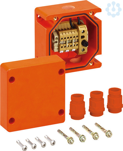 Abzweigkasten, mit Schutzart IP66, Ui=450V AC, zertifiziert durch VDE (DIN EN 61439-1/-2 (VDE 0660-600-1/-2)), M25, (3 seitlich), außenliegende Befestigungsstellen, mit elektrischem Funktionserhalt E30 nach DIN 4102 Teil 12, Gehäuse und Reihenklemmen bestehen aus halogenfreiem Spezialduroplast, orange, Abzweigkasten mit abgesichertem Abzweig, Verbindungskasten 3-polig, Abzweigkasten 3-polig, Anzahl klemmbarer Leiter pro Pol 4 x 0,5-4mm², Klemmvermögen pro Klemmstelle 1 x 0,5-4mm², Sicherungshalter (20 x 5mm) max. 6,3A
