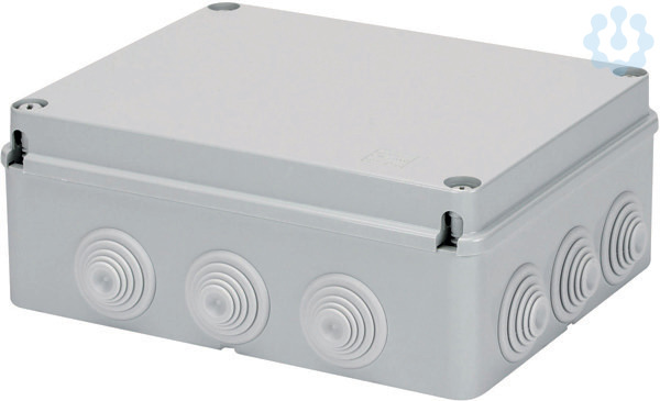 Abzweigkasten eckig, mit Kabeltuellen, geschlossenem flachem Schraubdeckel mit plombierbaren Kunststoffschrauben.