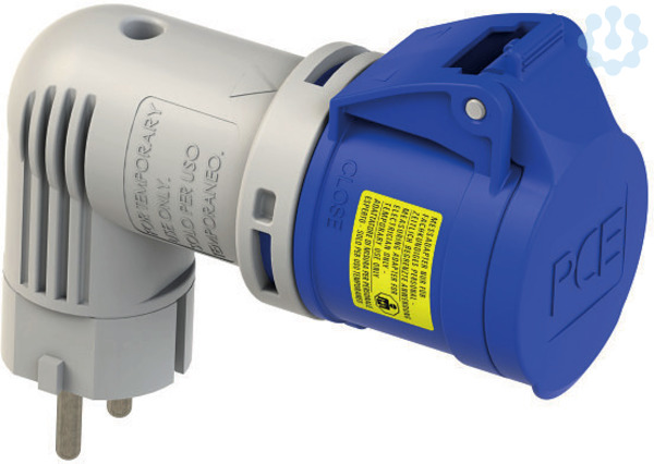Messadapter Schutzkontaktstecker 2 Erdungssystem / CEE-Steckdose 16A 3p 230V IP20, vernickelte Kontakte; (Eingang: 1 Stecker 16A 2p+E 250V (mit 2 Erdungssystemen), Ausgang: 1 CEE-Steckdose 16A 3p 230V); ; Nur für fachkundiges Personal und zeitlich begrenzte Anwendung!; Position des Phasen- und Neutralleiters an der Steckvorrichtung nicht bestimmt!