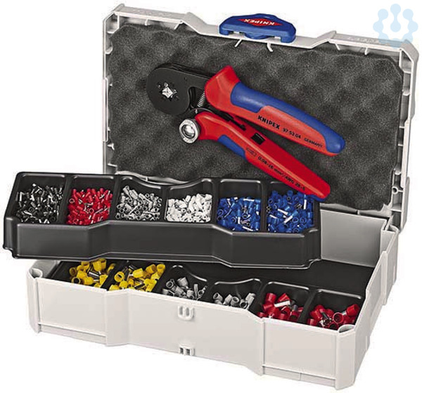 97 90 09 Crimp-Sortiment Im TANOS MINI-systainer® (stabile Kunststoffbox). T-Loc-Verschluss für Einhandbedienung: mit einem Dreh den systainer® öffnen oder schließen und mit einem zweiten systainer® verbinden.. Öffnen im verknüpften Zustand: Einfach und schnell auf die Inhalte zugreifen, ohne die Verbindung zu lösen.. Zwei stapelbare Kunststoffeinsätze mit je sechs Mulden für Verbinder. Mit einem Sortiment Aderendhülsen mit / ohne Kunststoffkragen. mit selbsteinstellender Crimpzange für Aderendhülsen 97 53 04. systainer® ist ein eingetragenes Warenzeichen der TANOS GmbH. Lieferumfang: 1 x 97 53 04 KNIPEX Selbsteinstellende Crimpzange für Aderendhülsen mit Seiteneinführung (0,08 – 10 + 16 mm²), 50 x KNIPEX Aderendhülsen mit Kunststoffkragen 14 / 8 mm (0,5 mm²), 100 x KNIPEX Aderendhülsen mit Kunststoffkragen 14 / 8 mm (0,75 mm²), 100 x KNIPEX Aderendhülsen mit Kunststoffkragen 14 / 8 mm (1 mm²), 200 x KNIPEX Aderendhülsen mit Kunststoffkragen 14 / 8 mm (1,5 mm²), 200 x KNIPEX Aderendhülsen mit Kunststoffkragen 14 / 8 mm (2,5 mm²), 200 x KNIPEX Aderendhülsen mit Kunststoffkragen 17 / 10 mm (4 mm²), 200 x KNIPEX Aderendhülsen mit Kunststoffkragen 20 / 12 mm (6 mm²), 200 x KNIPEX Aderendhülsen mit Kunststoffkragen 22 / 12 mm (10 mm²),