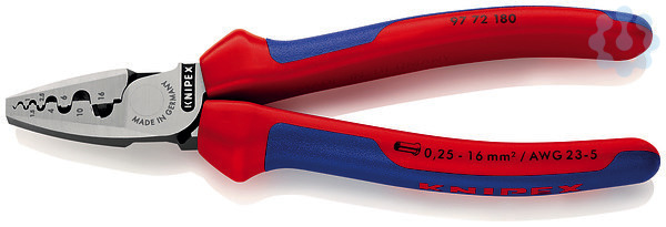 97 72 180 Crimpzange für Aderendhülsen leichte und schlanke Bauweise. auch als VDE-Version. leichtes Crimpen durch optimierte Übersetzung. Zum Verpressen von Aderendhülsen nach DIN 46228 Teil 1 + 4 im Bereich von 0,25 bis 16 mm². Verpressung in gekennzeichneten Halbrundprofilen für die sichere Verbindung von Hülse und Leiter. Neun besonders tiefe Profile mit konischen Seitenflächen. - Anwendung: Aderendhülsen - Kapazität Quadratmillimeter: 0,25 — 16,0mm² - Anzahl der Nester: 9 - AWG: 24 — 6