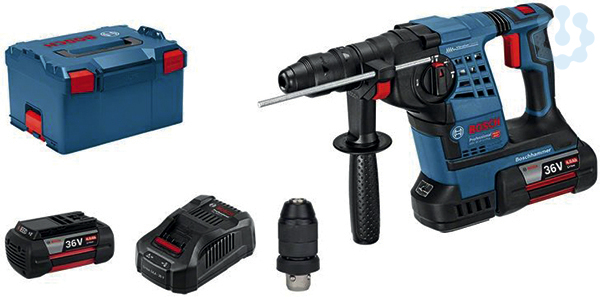 Akku-Bohrhammer mit SDS plus GBH 36 VF-LI Plus, Der GBH 36 V-LI Plus Professional ist der kraftvolle SDS plus-Akku-Bohrhammer mit 36 Volt für anspruchsvolle Arbeiten in Beton. Sein Schlagwerk liefert eine Schlagenergie von 3,2 J und sorgt für schnellen Arbeitsfortschritt. Der Bohrhammer verfügt außerdem über KickBack Control und Electronic Precision Control (EPC) für eine bessere Handhabung und hohen Anwenderschutz. Sein langlebiger 36V-Akku erleichtert einfache Meißelarbeiten durch eine längere Laufzeit. Dieses Elektrowerkzeug eignet sich zum Bohren und Meißeln in Beton, Mauerwerk, Holz und Metall. Er ist mit verschiedenen Staubabsaugungen sowie allen Bosch Professional 36V-Akkus und -Ladegeräten kompatibel. Ferner verfügt der GBH 36 V-LI Plus Professional über konstante Drehzahl, ein LED-Licht, Überlastkupplung, variable Drehzahl, Vario-Lock und Vibration Control. Zusatzhandgriff (2 602 025 191); Tiefenanschlag 310 mm (1 613 001 003); Schnellwechselbohrfutter 13 mm (2 608 572 212); 1/1 L-BOXX-Einlage für Gerät und Ladegerät (1 600 A00 4L0); L-BOXX 238 (1 600 A01 2G2); Schnelllader; Wechselfutter SDS plus (2 608 572 213); 2 x Akku GBA 36V 4.0Ah (1 600 Z00 03C)