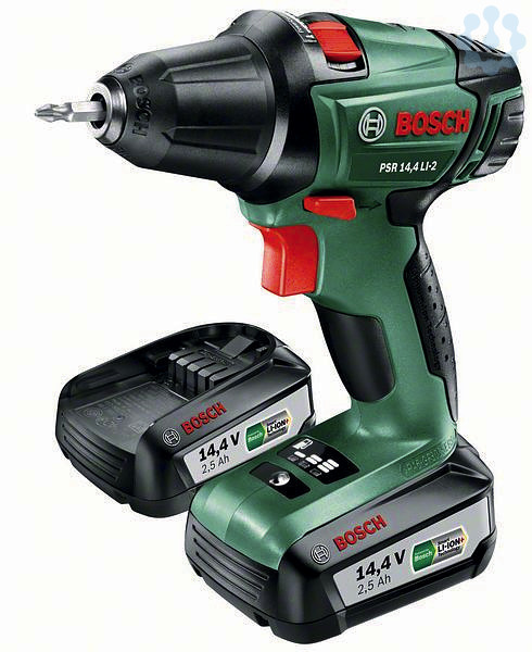 Akku-Zweigang-Bohrschrauber Lithium-Ionen PSR 14.4 LI-2. Der Handlichste und Komfortabelste seiner Klasse mit intelligenter Bosch PowerControl. Beste Handlichkeit seiner Klasse dank Lithium-Ionen-Technologie. 2-Gang-Hochleistungsplanetengetriebe: Überlegene Lebensdauer, beste Kraftübertragung, hohe Laufruhe. Innovative, elektronische Drehmomentvorwahl Bosch PowerControl mit integrierter Gangumschaltung – Optimale Kraft für jede Anwendung. Syneon Chip: Intelligent gesteuerte Energie für optimale Kraft und maximale Ausdauer bei jedem Projekt. Kein Memory-Effekt, keine Selbstentladung: Immer einsatzbereit dank Lithium-Ionen-Technologie. Bosch Electronic-Drehzahlsteuerung: Gas geben von 0 bis max. über den Schalterdrücker. Besonders hohe Langlebigkeit des wechselbaren Lithium-Ionen-Akkupacks durch Bosch Electronic Cell Protection (ECP). Schnellspannbohrfutter mit Bosch-Auto-Lock für schnellsten und einfachsten Werkzeugwechsel. PowerLight – Durch die eingebaute Leuchtdiode haben Sie Ihr Werkstück stets gut beleuchtet im Blick. Intelligente 3-stufige Ladezustandsanzeige. Hochleistungs-Akku und Schnellladegeräte für alle Heimwerker- und Gartengeräte des 14.4-Volt-Systems von Bosch. Doppelschrauberbit, Ladegerät AL 1830 CV, Kunststoffkoffer, 2 Akkupacks PBA 14.4V 2.5 Ah W-B.